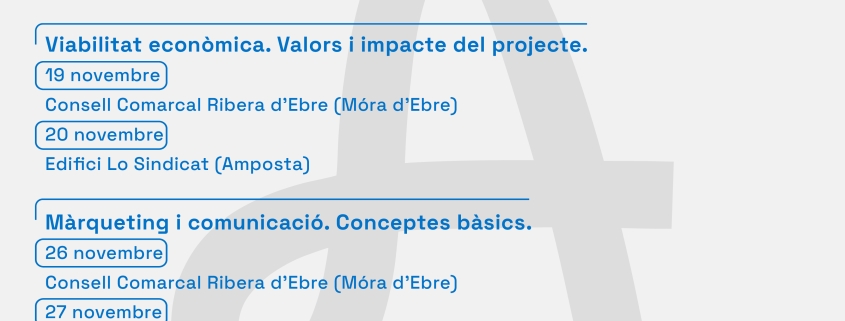 Durant el mes de novembre, les futures participants de l’Arrela’t_Terres de l’Ebre, rebran formació per al correcte desenvolupament de la memòria del seu projecte. En aquestes càpsules formatives es treballarà el model de negoci, la viabilitat i la comunicació del mateix. Aquestes formacions seran presencials a Mòra d’Ebre i a Amposta durant tres dies en setmanes consecutives.