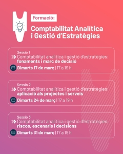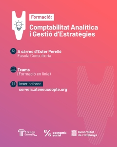 Vols deixar de prendre decisions “a ull” i començar a fer-les amb dades reals? Arriba una nova formació de l’Ateneu: Comptabilitat Analítica i Gestió d’Estratègies, un curs online de 3 sessions pensat per donar-te eines clares, pràctiques i aplicables des del primer dia. Treballarem els fonaments de la comptabilitat analítica, la seva aplicació als projectes i la presa de decisions estratègiques en contextos reals.