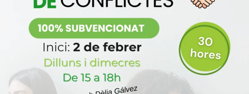 Curs de resolució de conflictes, 100% subvencionat i obert a tots els sectors professionals. La formació és presencial al centre BRM de Móra d’Ebre, amb excepció de dues sessions virtuals els dies 10 i 17 de febrer.