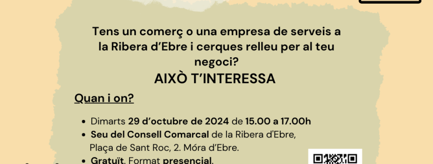 Des del Consell Comarcal de la Ribera d’Ebre, en el marc del projecte Ribera d’Ebre VIVA, s’organitza una jornada adreçada a les empreses del sector comercial i de serveis i a emprenedors de la comarca, amb l’objectiu de cercar relleu a negocis amb un horitzó de jubilació proper.