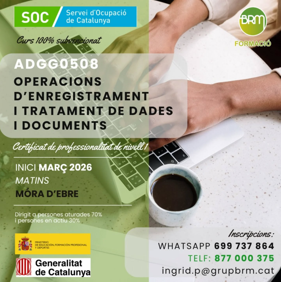 Curs 100% subvencionat per iniciar-se en tasques administratives bàsiques. Certificat de professionalitat de nivell 1, sense necessitat d’experiència prèvia. Formació pràctica i entenedora, orientada a millorar l’ocupabilitat. Horari de matins, inici al març de 2026 a Móra d’Ebre. Places limitades.