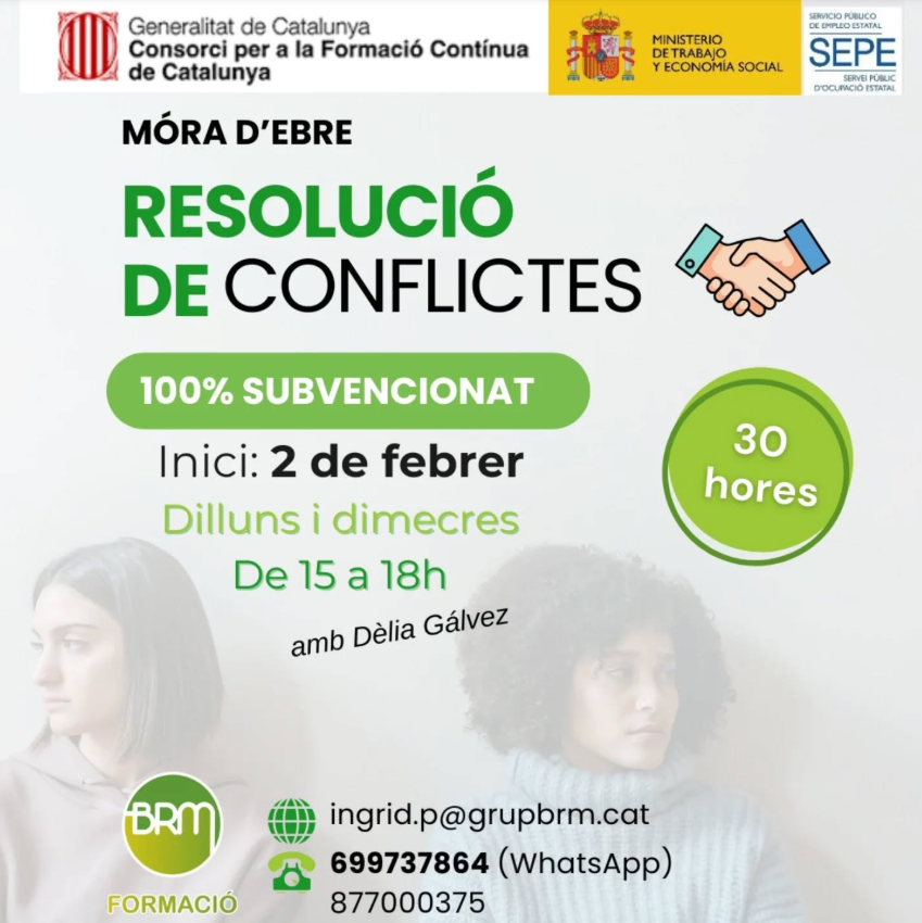 Curs de resolució de conflictes, 100% subvencionat, presencial a Móra d’Ebre amb dues sessions virtuals. Aprèn eines pràctiques per millorar la comunicació i reduir tensions laborals. Places limitades.