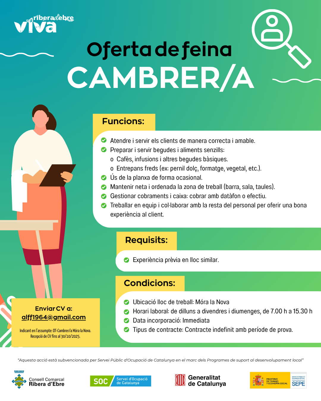 ⚠️ alff1964@gmail.com indicant en l’assumpte: OT-Cambrer/a Móra la Nova. Recepció de CV fins al 30/10/2025.